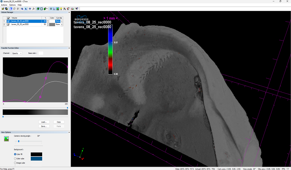 “Utilizando una fuente de emisión de rayos X y analizando la absorción de los diferentes componentes, nos permite reconstruir digitalmente en tres dimensiones el modelo de una muestra sin destruirla con una resolución máxima de 3µm/pixel y un volumen máximo de 500mm x 300mm y 25kgr de peso. Después de realizar una reconstrucción geométrica tridimensional, uno puede seccionar el modelo generado, cortarlo digitalmente y observar cómo es su estructura y propiedades internas”, explica Nicolás Scivetti, profesional de apoyo del IPGP y uno de los responsables técnicos del equipo.