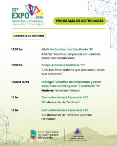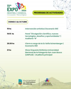 El viernes a las 14, la OVT será protagonista de un “Diálogo abierto entre el CONICET-CENPAT y el sector productivo para co-crear soluciones”, donde la intención es escuchar activamente y comprender los desafíos y necesidades actuales del sector industrial. A las 15, Carlos De Marziani (IIDEPyS, CONICET- UNPSJB) disertará sobre “Internet de las cosas, monitoreo inteligente y gemelos digitales: TICs aplicadas a la gestión productiva y ambiental del Golfo San Jorge”, mientras que Héctor Álvarez (INBIOP, CONICET-UNPSJB) hará lo propio con “De la ciencia hacia la aplicación en Biotecnología. Investigación y desarrollo en Biotecnología”.