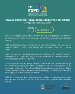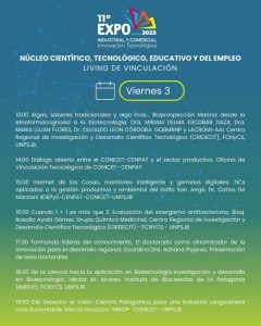 El jueves a las 14.30, la OVT brindará una charla denominada “Ciencia al servicio de la industria: La oferta tecnológica y de servicios del CONICET-CENPAT”, mientras que a las 15.30 la investigadora Mariana Lozada (IBIOMAR-CONICET) brindará detalles sobre el Programa Interdisciplinario de Cannabis.