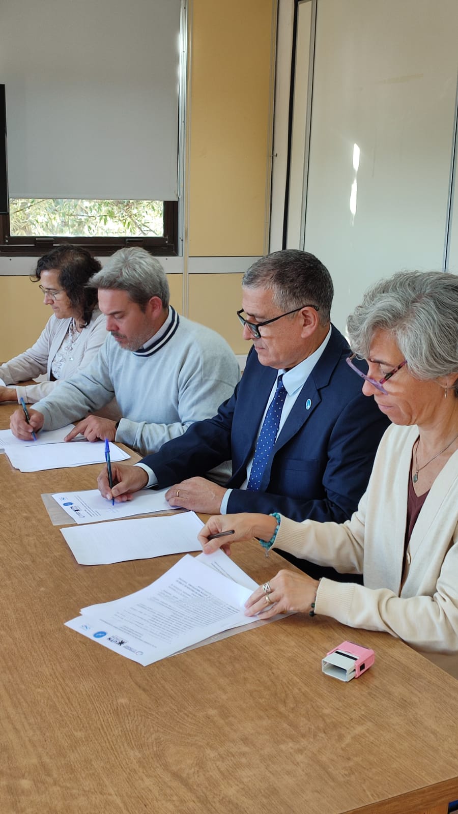 El director del CCT CONICET-CENPAT, Nicolás Ortiz, junto al rector de la Universidad Nacional de la Patagonia San Juan Bosco, Gustavo Fleitas; la rectora de la Universidad del Chubut (UdC), Marcela Freytes; y la decana de la Facultad Regional Chubut de la Universidad Tecnológica Nacional (UTN), Diana Bohn, suscribieron este lunes un acta acuerdo para la creación de la “Comunidad Koha Chubut”, una red de intercambio de experiencias en relación con la gestión bibliotecaria y el desarrollo de nuevas funcionalidades del sistema Koha, un software libre y abierto de gestión bibliotecaria que buscan modernizar sus servicios con una solución flexible y colaborativa, adoptado por diversas Unidades de Información de la provincia de Chubut superando la fragmentación profesional para construir un espacio común de saberes